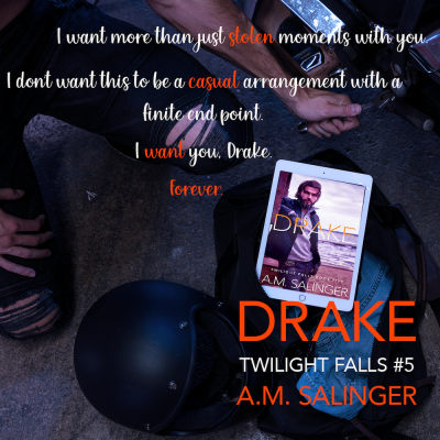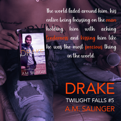 Today, I’m hosting author A.M. Salinger and her latest release Drake, book five in the Twilight Falls series, a m/m contemporary romance. Be sure to read my review of this novel. And don’t forget to enter the Rafflecopter giveaway.