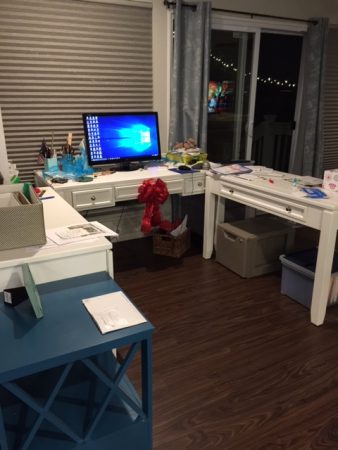 Marsha: Several years ago, we downsized to a much smaller home which happens to be on a lake. Yea. So blessed. We have great views because we have many windows, just not many rooms. My space is in the main family room. The bow in the picture is no longer there and the turquoise table is gone, too. But the same basic U-shape remains, making its own little room within the larger space of the open living, kitchen, dining area. I keep the shades behind the computer screen down because of light and distractions, but I can still look through the doors on my right to the yard and lake. I recently bought a new chair which has helped back and shoulder problems a bunch. I spend a lot of time in this beautiful spot. When I’m creating, I keep a small stuffed dog called Scruffy out on my desk to remind me to let go and have fun.