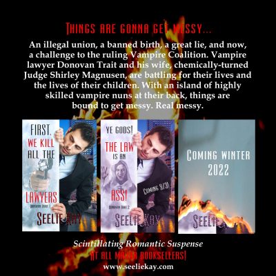 Seelie:  Donovan Trait is a vampire lawyer. In the human world, a very respected lawyer. I wanted to give him the opportunity to shine in the vampire world. So I created a scenario where his turned vampire bride Shirley is unfairly punished for an unintentionally violating their marital agreement, as well as other outdated, outrageous, and outright discriminatory laws—she unintentionally  To survive and protect their unborn child, they must not only fight back, but also rebel. In this instance, human history provides them with the path. That gave me the opportunity to draw parallels between the fight for human rights and the rights of vampires who aren’t purebloods. It also allowed me to poke at the continued need of both societies to embrace social change. Perhaps surprisingly, the vampires lag far behind the humans in terms of equality and individual freedoms. However, in the end, the message is clear: Whether human or vampire, an individual is entitled to certain rights and liberties. And no human or vampire has a right to deny them.