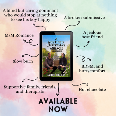 Jaiyde: Interesting question. I haven’t read many MM Christmas romances, but I feel that Colin’s assault paired with the inclusiveness of the club and the feeling that the ending brings is what sets it apart. These men went through so much to be together, and to have a scene in this inclusive BDSM club where successes are celebrated and wounds are healed makes this story different from other MM stories. The scene didn’t happen on Christmas, but there were Christmas elements, and the holiday and the cheer that it brings is a magical time.