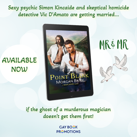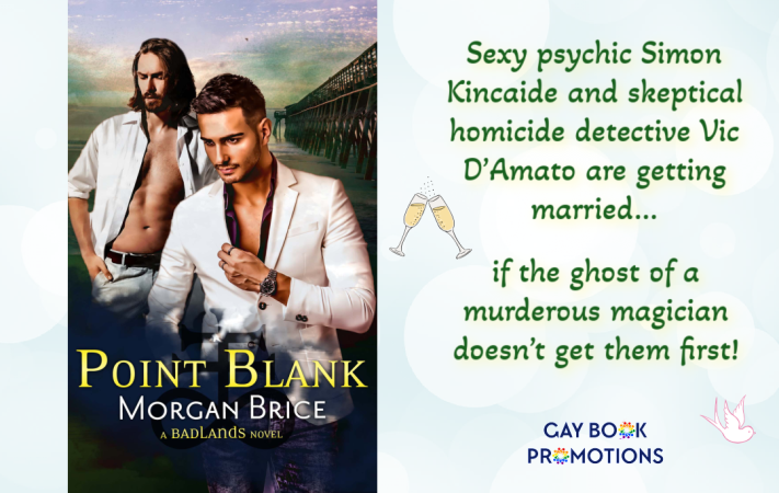Point Blank is a fast-paced thrill ride MM paranormal romance packed with supernatural suspense, sinister sleight-of-hand, mysterious monsters, psychic visions, hot men, hurt/comfort, loyal friends, wedding planning, found family, ghosts galore, dark magic, and an evolving, established romantic relationship with all the feels.