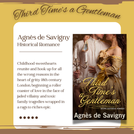 Her second novel, the epic historical romance Third Time’s a Gentleman set in the mid 18th century, was soft released in the summer of 2022. Wide release is scheduled before the end of 2023.