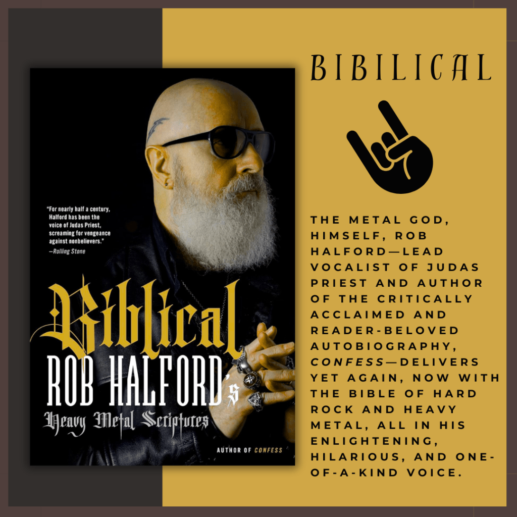 Blurb: Rob Halford has long been known for his legendary voice. As the front man of Judas Priest, his vocals have been tremendous, and tremendously influential. In 2020, he brought his voice to the page with a glorious autobiography. Fans and readers loved Halford’s frank and open narrative, as well as his terrific insight and sense of humor. In an ideal follow-up, Halford runs his lively eye over all facets of the hard rock history and the heavy metal world. Biblical is an encyclopedia and manifesto in which Halford shares his opinions, memories, and anecdotes regarding every element of the rock and roll work and lifestyle from tours to tattoos, riffs to riders, and drugs to devil horns. In Halford’s relaxed and honest tone, the book mixes serious and in-depth pieces with whimsical reflections on lessons learned during his fifty years of a life in music. Biblical is a handed-down-from-on-high holy tome that transports fans behind the scenes and back into their record collections, to the almighty ways of rock.