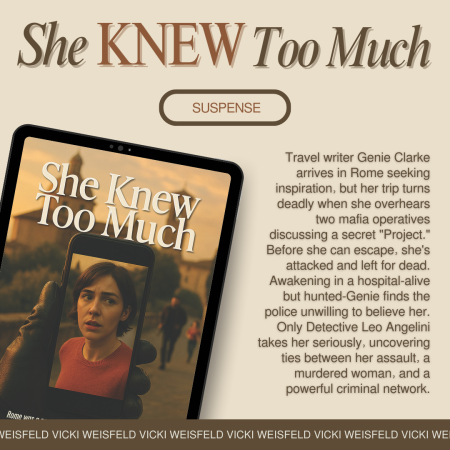 Today, award-winning author Vicki Weisfeld is guesting. She’s talking about her latest release, She Knew Too Much, a suspense novel. Don’t forget to enter the King Sumo giveaway.